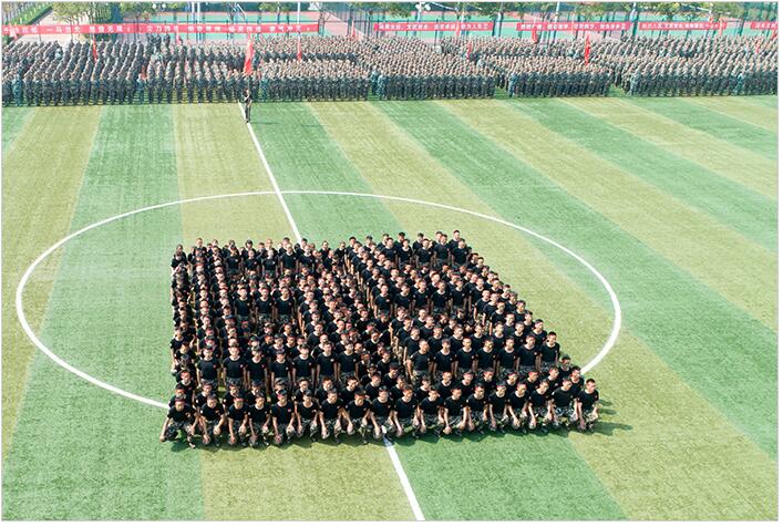 2018级新生军训汇报演出时摆出65造型庆祝学校65周年华诞