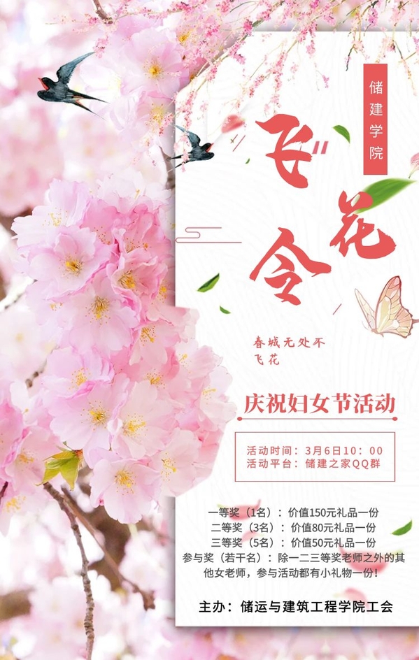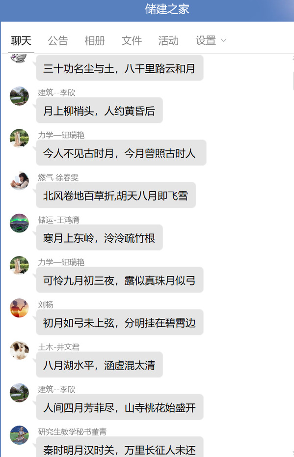 “飞花令”在疫情防控的特殊时期,以古诗词为载体,重温经典传统文化,展示女教职工的博学多才。活动得到了老师们的踊跃参与,精彩不断,随着“春”“花”“雪”“月”四个关键字的题目依次而出,女老师们在群中妙句频出,“草树知春不久归,百般红紫斗芳菲”“竹外桃花三两枝,春江水暖鸭先知”“水晶帘外娟娟月,梨花枝上层层雪”“独上高楼思渺然,月光如水水如天”,优美的诗句把大家引入了诗歌美妙的意境之中。学院男老师们也在群中围观活动,为女老师加油喝彩,老师们才思如泉涌,妙语连珠。“飞花令”活动共收集诗词佳句300余句,活动氛围十分热烈。