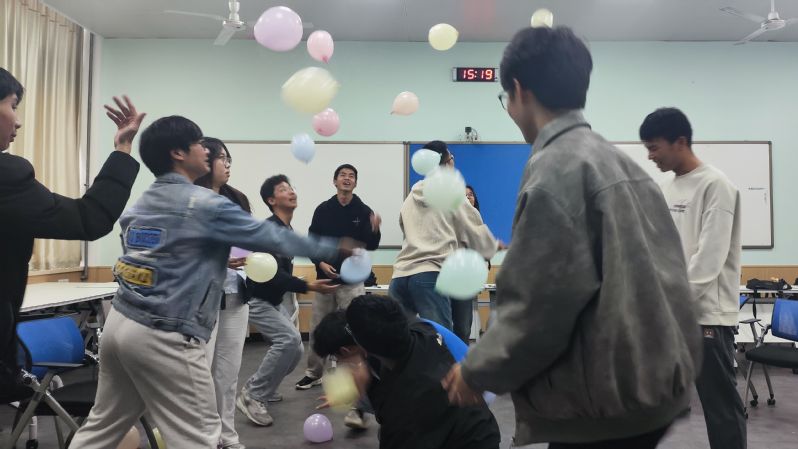 本次工作坊采用“破冰—认知—疗愈”三阶模式,层层深入,帮助同学们释放压力、增强自我觉察,并学会用更积极的心态应对挑战。活动伊始,王人立组织大家围坐成圈,进行“乌龟与乌鸦”心理游戏。在活动中,同学们需左手食指向上,右手掌心向下,在听到关键词时迅速做出反应。这一趣味互动不仅活跃了现场氛围,更训练了同学们专注力和应激反应能力。在第二环节,王人立引导同学们进行“拍手掌说美德”活动——每拍一次手,就要说出自己的一个优点。通过正向自我暗示,同学们打破自我设限,增强自信,学会以更积极的视角看待自身价值。核心环节采用“书写—释放—共商”的创新模式,同学们匿名书写近期开心与烦恼事件,将纸条装入气球混合传递。在随机选取气球并踩爆后,全体成员对抽取的问题进行集体思考并讨论如何解决问题。