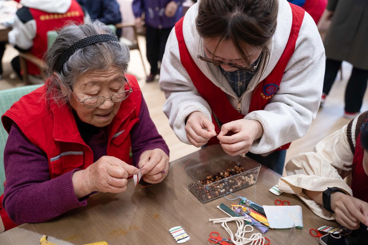 老人和团支部成员做香囊 刘令仪摄