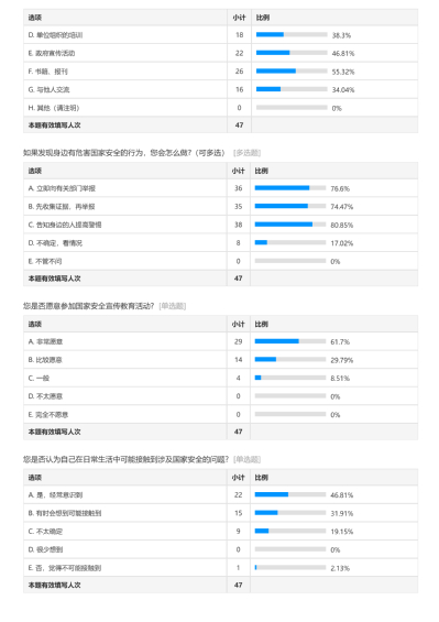 4月11日,团支部书记刘小琪紧扣活动需要,牵头设计包含“个人基本信息”“国家安全认知”“信息获取渠道”“应对措施及意愿”“日常关联感知”“文化安全及作用认知”等六个维度的调查问卷,团支部成员在线上分发问卷,收集统计数据,根据调研结果,形成相关报告,初步掌握了群众对国家安全的认知情况,为后续针对性开展理论知识学习活动打下基础,找到了推广安全教育的切入点。