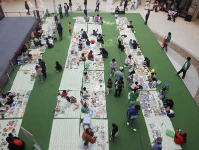 活动围绕三大特色环节有序推进。在流动市集环节,市民可自由交易二手书籍及阅读相关旧物,支部成员担任指引员维护秩序;一旁的绿茵环保协会公益摊位上,市民通过回答绿色环保问题兑换书签,体验用可回收垃圾制作版画,在实践中增强对环保的认识。在以书换蔬环节,支部成员用新鲜青菜与市民珍藏的书籍做交换,“凭书换圈、以圈套蔬”的趣味规则吸引众多市民踊跃参与。图书漂流瓶活动中,市民亲手写下对被赠书者的寄语,同时收获黄岛区垃圾分类协会精心准备的福袋作为纪念。活动结束后,收集到的图书将捐赠给社区图书室。