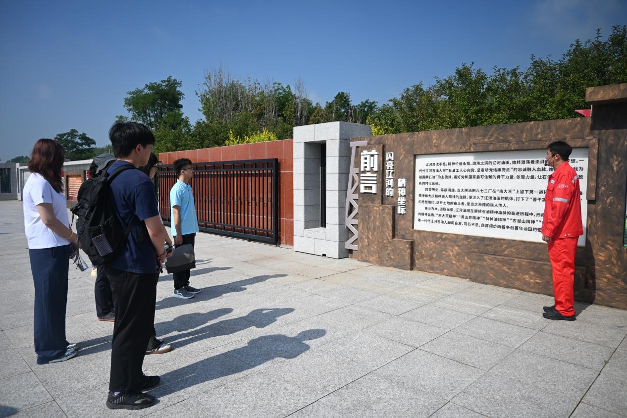 在辽河油田相关工作人员的带领下,实践队深入调研了辽一井、黄五井、石油工业遗产基地。通过实地讲解,实践队员系统了解辽河油田从1970年“南大荒”创业起步,到攻克稠油、高凝油、超稠油开发世界级难题的完整历程。据讲解员介绍,辽河油田地质构造复杂,油品类型多样,老一辈石油人以“千把钥匙开千把锁”的恒心与毅力,实现连续千万吨规模稳产,铸就“世界稠油看中国,中国稠油看辽河”的行业标杆,凝练形成“开拓创新、油稠人不愁”的特种油精神,成为一代代辽河油田人攻坚克难的信念灯塔。