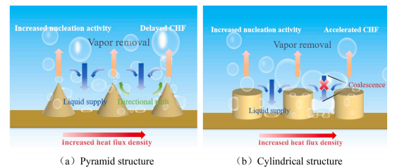 混合工质在微通道内的流动沸腾是解决高热流密度散热问题的有效途径,但传统结构存在传质阻力大、核态沸腾延迟等挑战。为解决这一难题,本研究以正戊烷/正己烷混合工质为对象,考察了菱形翅片微通道在不同入口过冷度、质量流量及组分浓度下的传热与压降特性。实验发现,入口过冷度、质量流量和混合程度对核态沸腾起始、传热系数和压降均存在影响。同时,对比菱形翅片微通道与普通直矩形微通道的性能表明,不同热流密度下两种结构各具优势。通过可视化观测发现,菱形翅片结构对热边界层和液膜形成具有一定影响,该研究为微通道结构优化和混合工质流动沸腾传热提供了实验数据和理论参考。