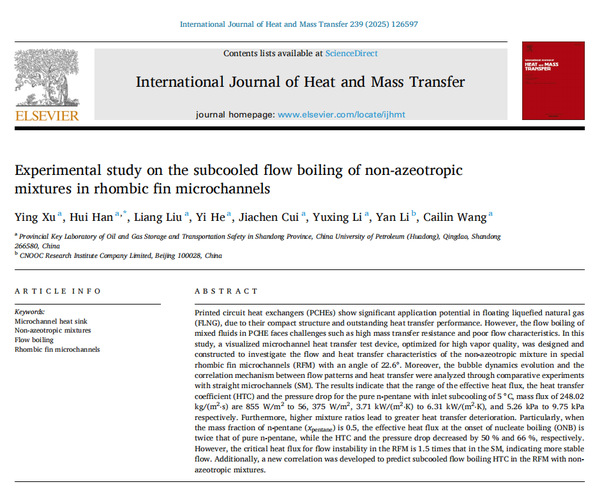 近期,公司韩辉教授团队在非共沸工质传热强化和机理研究方面取得新进展,相关研究成果《Experimental investigation on pool boiling bubble growth of pure pentane and non-azeotropic mixtures of pentane/hexane on heated surface》发表在《International Communications in Heat and Mass Transfer》;《Experimental study on the subcooled flow boiling of non-azeotropic mixtures in rhombic fin microchannels》和《Experimental study of pool boiling characteristics for non-azeotropic mixtures n-pentane/n-hexane on microstructure surfaces》发表在《International Journal of Heat and Mass Transfer》。发表期刊为传热传质领域著名期刊。论文通讯作者为韩辉教授,VKGAME威客电竞为第一署名单位和唯一通讯单位。上述研究得到国家自然科学基金项目资助。