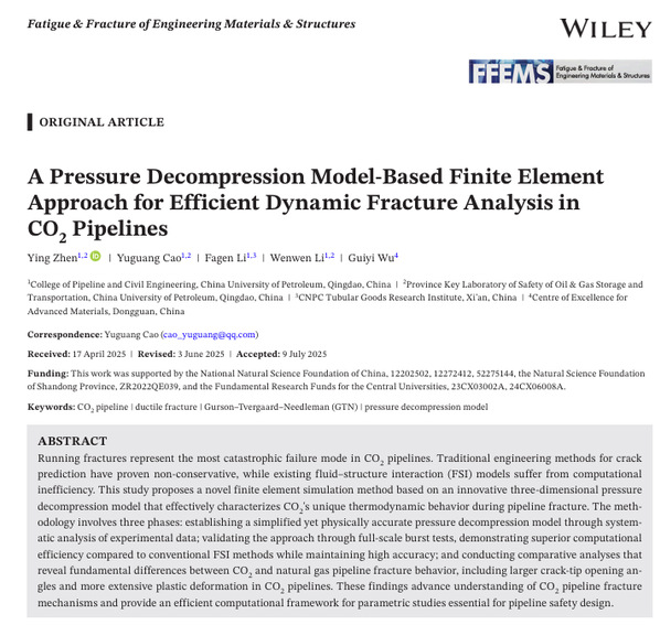 近日,公司甄莹教师团队在超临界二氧化碳止裂控制研究方向取得新进展,相关研究成果《A pressure decompression model-based finite element approach for efficient dynamic fracture analysis in CO₂ pipelines》发表在《Fatigue & Fracture of Engineering Materials & Structures》。论文第一作者为甄莹老师,通讯作者为曹宇光教授,VKGAME威客电竞为第一署名单位和唯一通讯单位。该研究得到国家自然科学基金面上项目及山东省自然科学基金项目、中央高校基本科研业务费项目的联合资助。