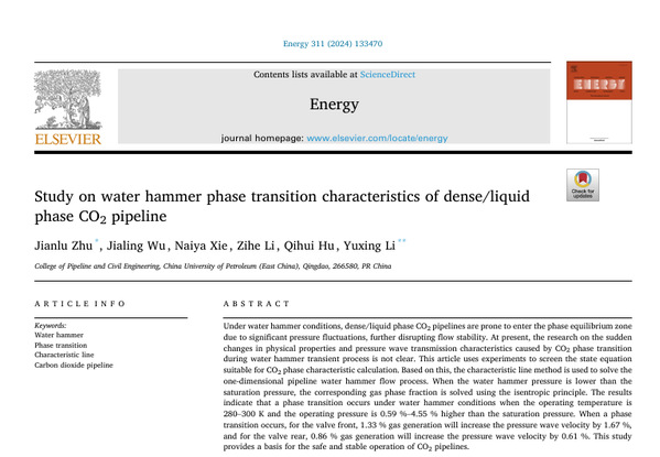 密相及液相二氧化碳管道在水击条件下易进入相平衡区,引发剧烈的压力波动与流动不稳定。本研究结合相平衡实验与数值模拟,筛选出适用于二氧化碳相变计算的状态方程,并基于特征线法与等熵原理建立了一维水击瞬态流动模型。研究发现,当运行温度为280–300 K且压力高于饱和压力0.59%–4.55%时,管道将进入气液两相区。研究揭示了二氧化碳在水击过程中的瞬态相变耦合规律及其对压力波传播特性的影响,为CCUS管道的动态控制与安全运行提供了理论依据。
