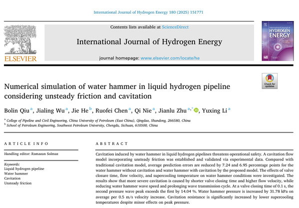 液氢在极低温条件下输送时具有高压缩性与高饱和蒸气压,其在水击作用下易发生剧烈相变和汽蚀,是氢能输送系统安全的关键挑战。针对传统模型未能准确描述非稳态摩擦效应与相变耦合特征的问题,提出了耦合非定常摩擦效应的改进瞬态模型,实现了液氢管道中非稳态摩擦、气腔演化及相变过程的耦合模拟。研究结果表明,该模型在压力波衰减和相变预测方面具有更高精度,揭示了阀门关闭速率、流动状态与过冷度等因素对汽蚀强度及相变行为的影响规律。该研究深化了对液氢在水击条件下相变耦合与能量传递机理的理解,为氢能输送系统的动态安全评估与工程防护提供了理论支撑。
